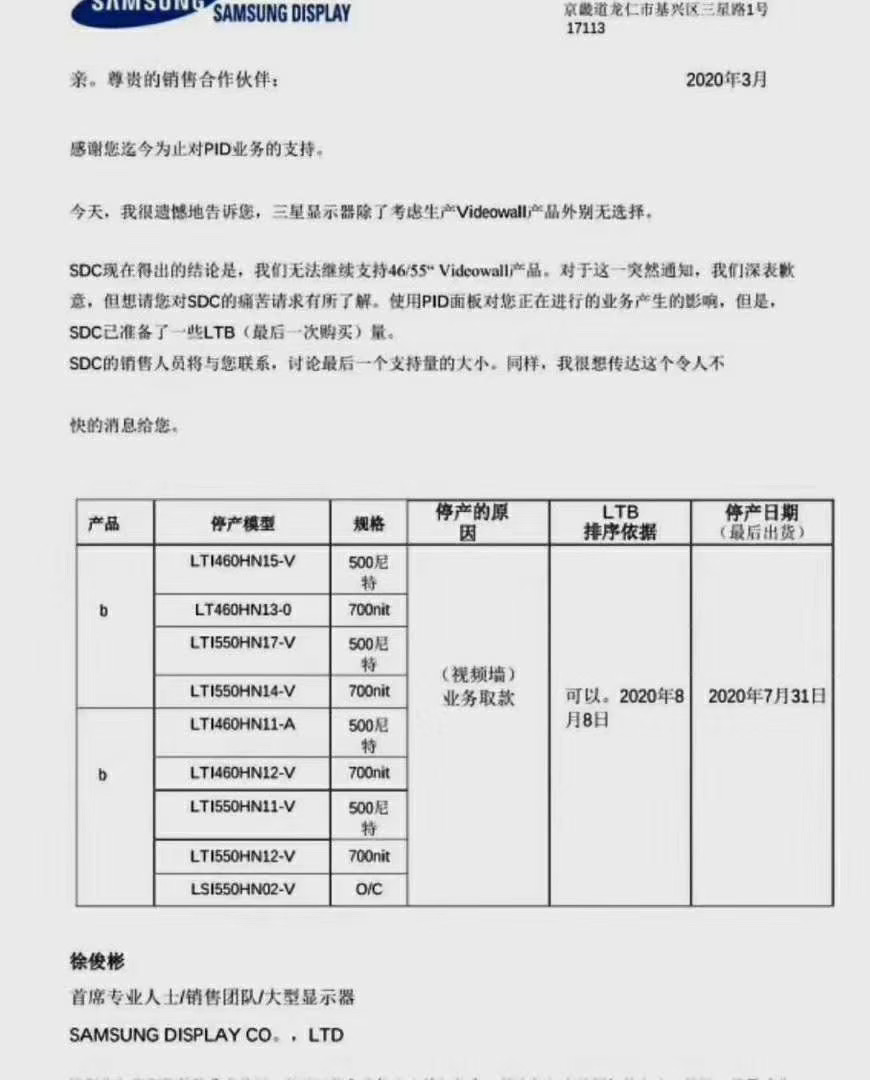 但是,2020年商顯液晶面板商業的壞消息還是來了,轉至原文:尊貴的合作伙伴,三星將在7月生產最后一批屏后,于7月將全線停產生產,所有產品型號的拼接屏,請各位知悉,并做好相應的準備,謝謝!