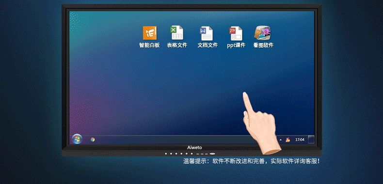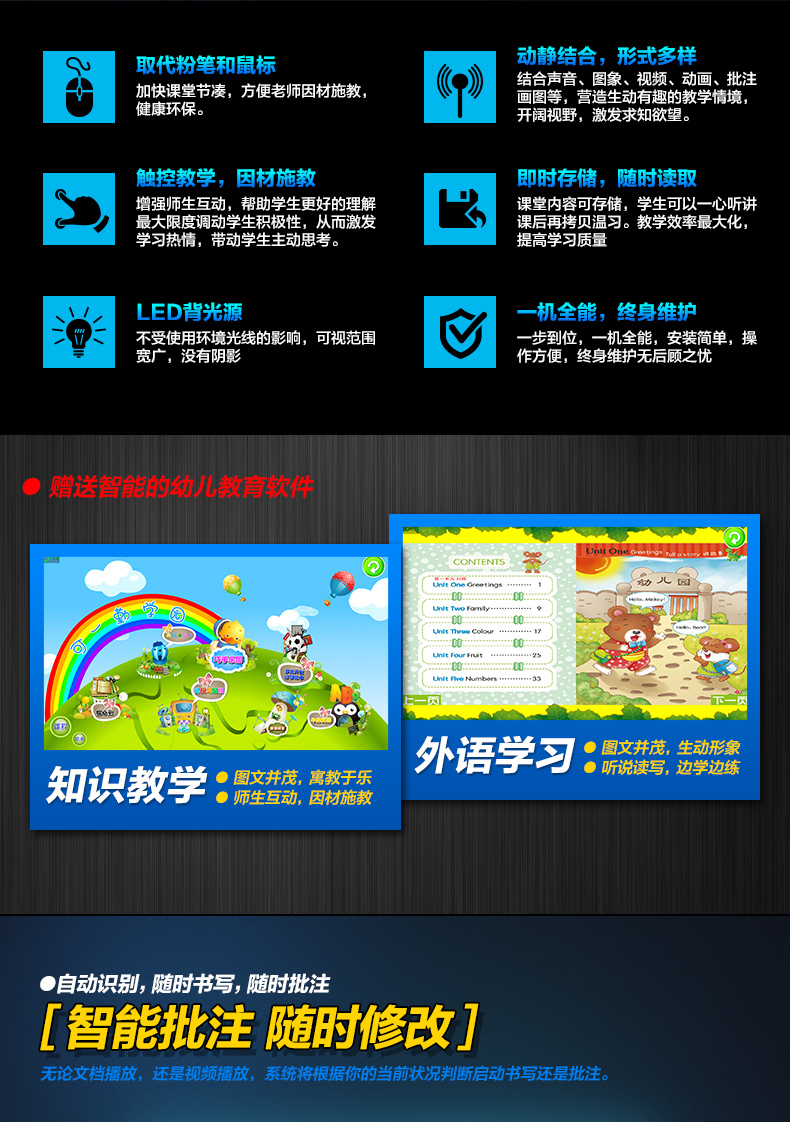 AW系列-多媒體教學(xué)一體機(jī),高清大屏顯示,壁掛支架多種使用方式,人性化機(jī)型設(shè)計(jì),立式與掛式兩種使用方法可交替使用,避免使用環(huán)境發(fā)生變化時(shí)產(chǎn)生的資源浪費(fèi)問題采用LED背光源長(zhǎng)壽命,低功耗,環(huán)保節(jié)能。智能電子白板,各種文件一鍵加載,多點(diǎn)觸控智能電子白板適用于各種商務(wù)會(huì)議,支持手寫批注,兼容日常office辦公軟件,本地、U盤、網(wǎng)盤、局域網(wǎng)數(shù)據(jù)輕松駕馭。書寫流暢,減少視覺誤差,高端企業(yè)必備,多重主題背景,筆形色彩,任意選擇。高端配置 讓運(yùn)行速度,完美兼容WIN7,WIN8 隨意切換。