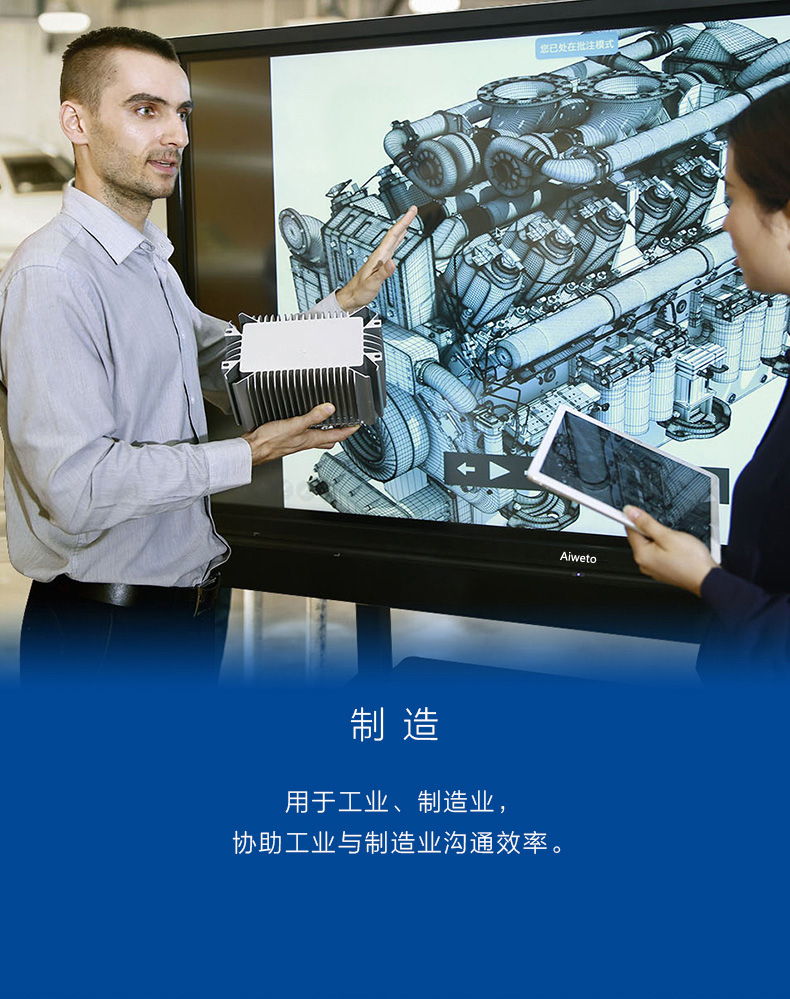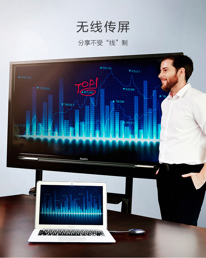 Aiweto(艾維圖)會議多媒體觸摸一體機采用LG商用IPS硬屏,全高(1920*1080)顯示,具有178度視角,高對比度和亮度,3D數(shù)字降噪,智能消除殘影、重影等失真現(xiàn)象,使得顯示畫面更清晰,穩(wěn)定,色彩更鮮艷;