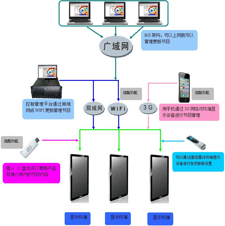 多種網絡 方便實用 支持局域網、廣域網等組網方式,終端可通過LAN、WIFI、WLAN、3G網絡鏈接入網,滿足有線無線聯網需求;無網絡時,將做好的節目通過U盤也能更新 |